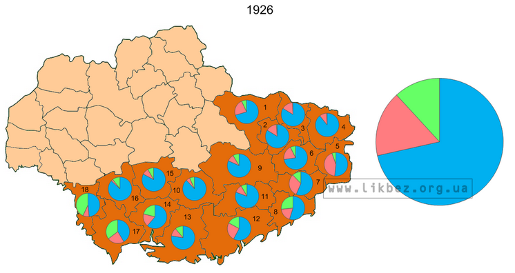 В момент проведення першого всесоюзного перепису населення 17 грудня 1926 року, Україна, в адміністративному плані, складалася з округ. У наведеній нижче таблиці округи відібрані за принципом кореляції, як з колишнім простором південно-східних губерній, так і з подальшими уявленнями про районування української території. У даному перепису, на відміну від імперського, ставилося питання про національність, і замість малоросів вже присутні українці.