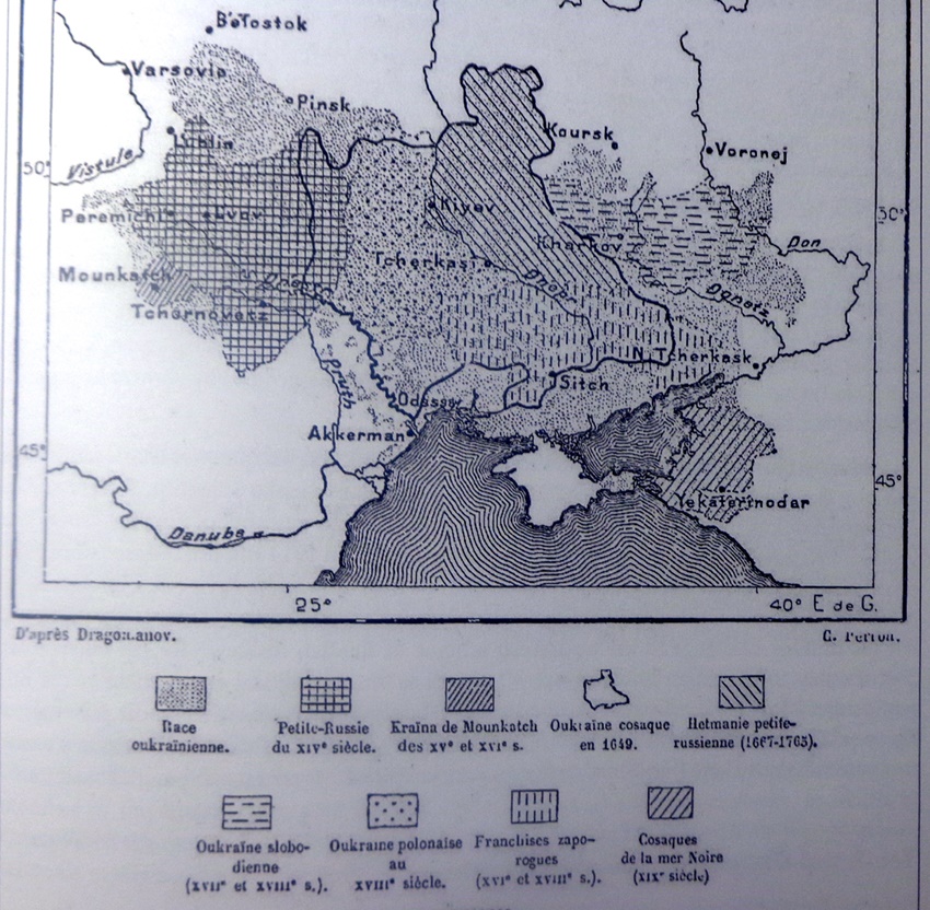 Умовні позначення: 1) Український народ; 2) Мала Русь до XIV ст.; 3) Мукачівська Країна (XV-XVI ст.); 4) Україна козацька в 1649 році; 5) Гетьманат малоросійський (1667-1765); 6) Слобідська Україна (XVII-XVIII ст.); 6) Україна польська (із XVIII ст.); 7) Вольності Запорозькі (XVI-XVIII ст.); 8) Чорноморське козацтво (із XIX ст.).