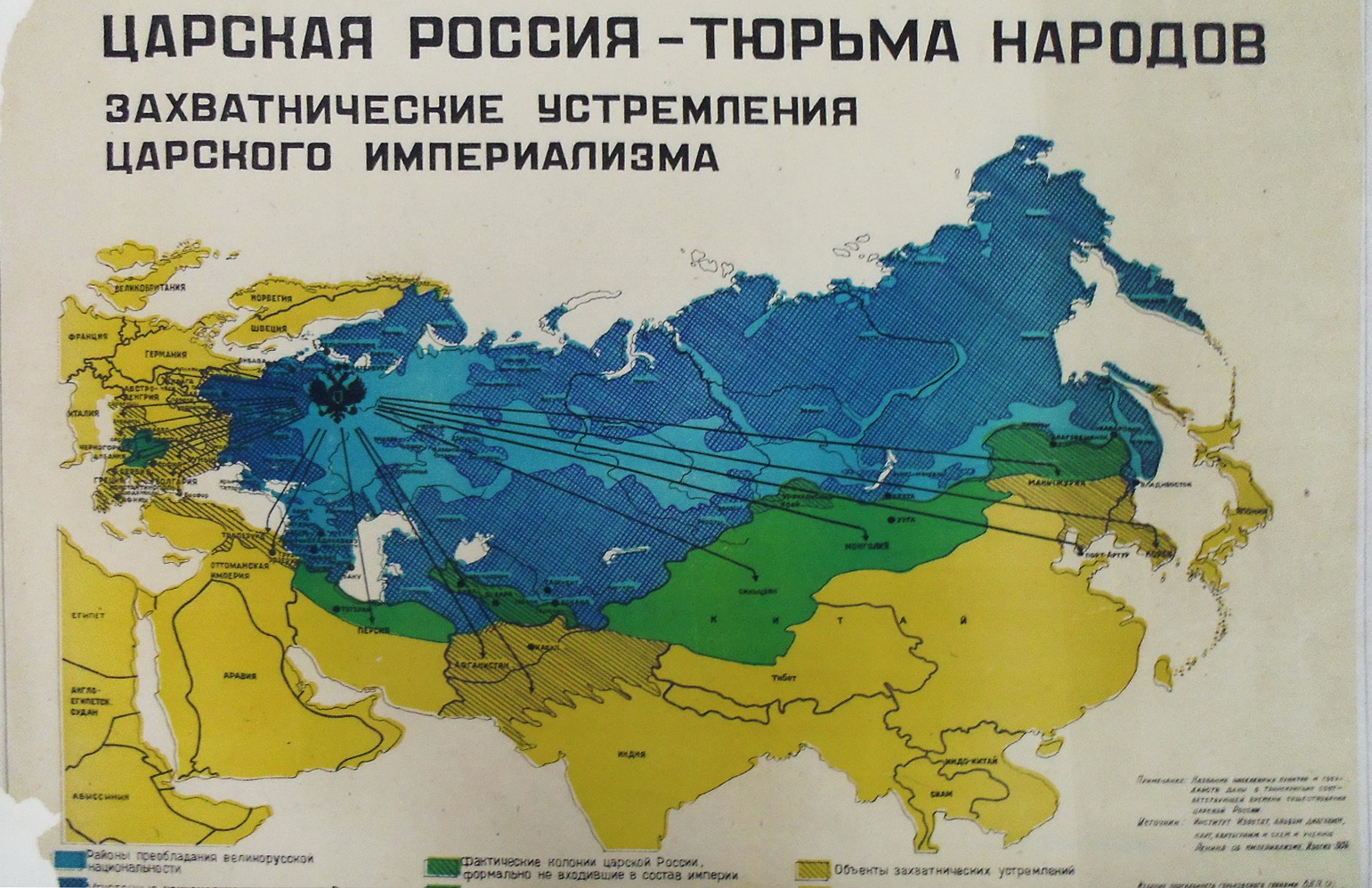 Карта була надрукованою Горьківським міськкомом ВКП (б) у 1936 р. як копія карти з видання: Альбом диаграмм, карт, картограмм и схем к учению Ленина об империализме. Институт ИЗОСТАТ, Москва, 1935. Легенда: блакитне – “райони переважання великоруської національності”, синя штриховка – “пригнічені національності у царській Росії”, зелене зі штриховкою – “фактичні колонії царскої Росії”, зелене без штриховки – “сфера переважного впливу царської імперії”, чорна штриховка по жовтому – “обєкти загарбницьких устремлінь”. Через рік, у 1937, Інститут ІЗОСТАТ, якй робив, сучасною мовою, “інфографіку”, буде ліквідовано.