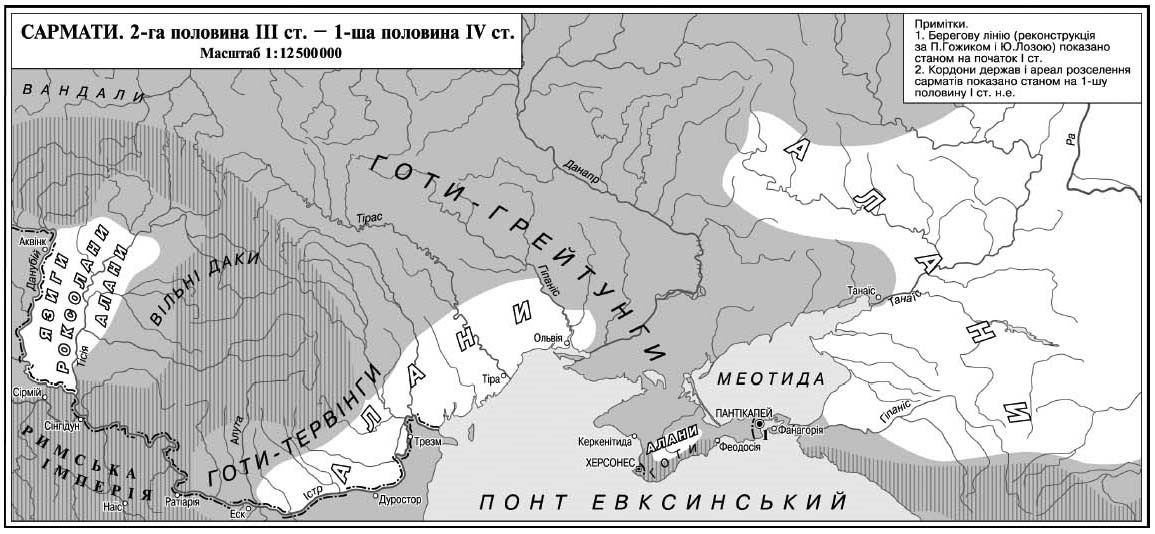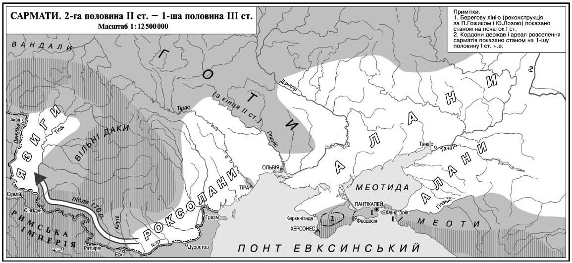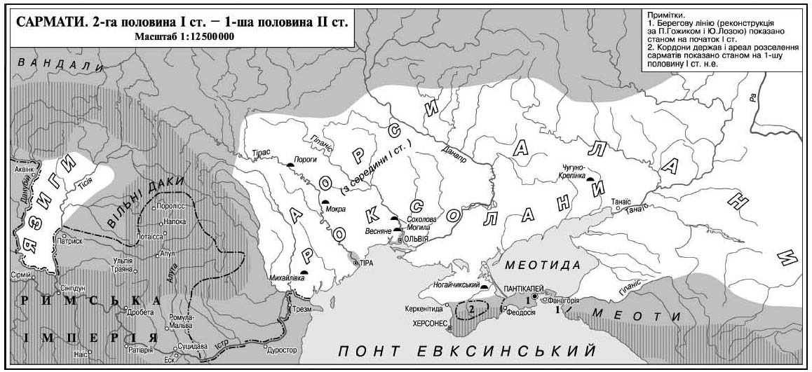 Достеменних підстав твердити про те, що на початок ІІ ст. роксолани повністю звільнили Правобережний Степ, джерела не містять. Ба більше, археологічні матеріали (підкурганні сарматські поховання у простих ґрунтових ямах, орієнтовані на північ, що ототожнюються із роксоланами) свідчать на користь того, що саме роксолани складали основне населення Степу між Дніпром та Дунаєм протягом І – ІІ ст. н.е.