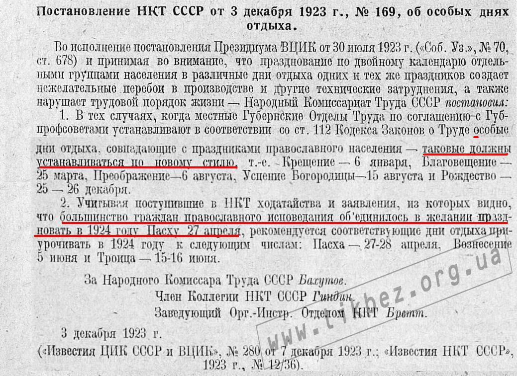 Цього ж таки 1923 р. було упорядковано датування «особливих днів відпочинку». 30 липня Всеросійський ЦВК, а 3 грудня 1923 р. і наркомат праці СРСР, затвердили рішення про використання «нового стилю» для релігійних свят із постійними датами. Великдень та прив’язані до нього свята було дозволено відзначати за приписами православної церкви. Така практика збереглася і в наступні роки.