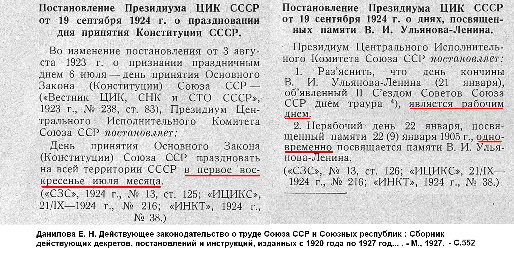 Однак насправді додатково відпочити від роботи у жодну із нових дат громадянам СРСР так і не поталанило. В 1924 р. 6 липня припало на неділю. А вже 19 вересня цього ж таки року ЦВК СРСР видав одразу дві постанови, якими кількість вихідних днів зменшилася. Під «роздачу» потрапили останні нововведення. Вони, втім, не зникли з календаря: День Конституції СРСР було вирішено святкувати у першу неділю липня, а урочисто вшановувати пам’ять про Леніна пропонувалося 22 січня. Тобто в один день тепер мали відзначатися дві події: