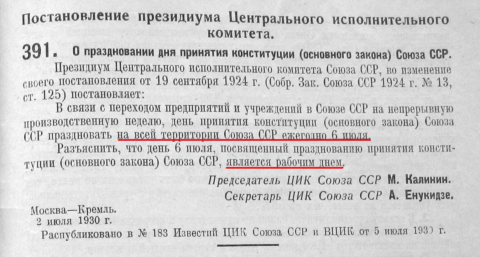 Наскільки це рішення було втілене в життя – то предмет окремого дослідження. Однак відома постанова Президії ЦВК СРСР від 2 липня 1930 р. про відзначення 6 липня – дня Конституції СРСР: