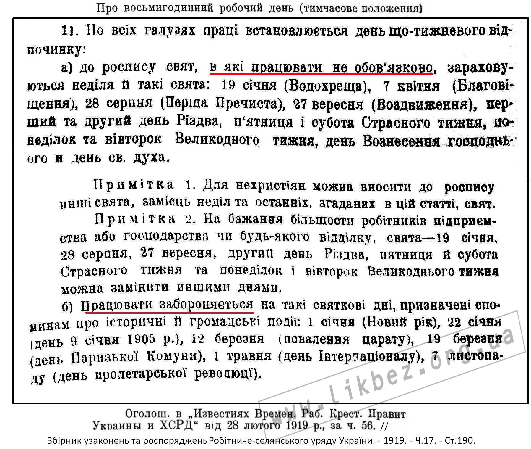 По-четверте, в положенні від Наркомпраці УСРР немає наявної в російському варіанті згадки про неоплачуваність праці в традиційні свята.