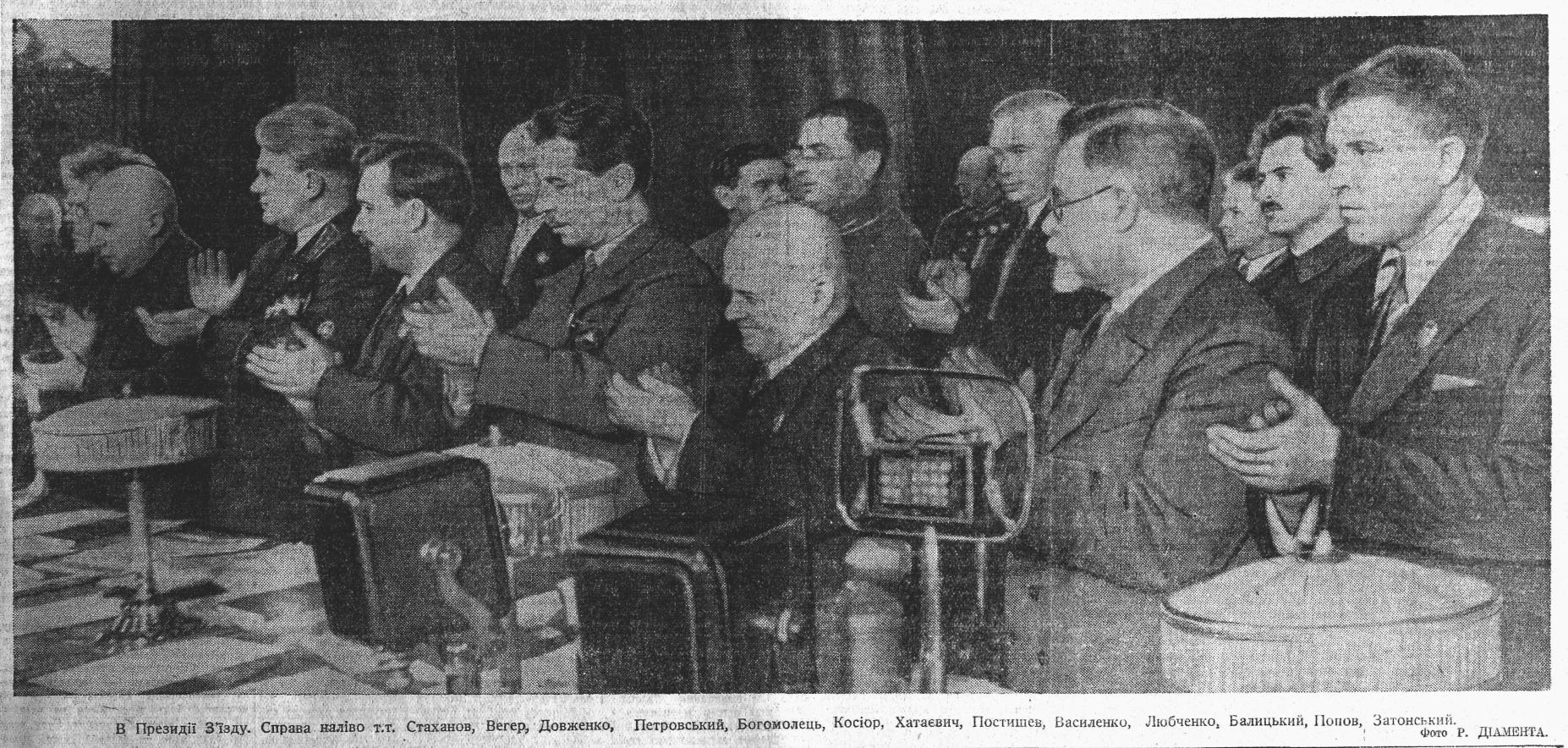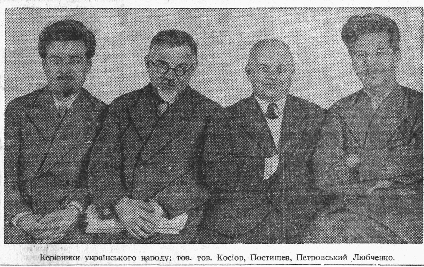 Головні дійові особи в компартійно-радянському керівництві УРСР протягом 1933-1937 рр. Зліва направо: голова уряду Панас Любченко, очільник ЦВК УРСР Григорій Петровський, перший секретар ЦК КП(б))У Станіслав Косіор, другий секретар ЦК КП(б)У і насправді головна особа в тогочасній радянській Україні Павло Постишев. // Вісті ЦВК УРСР. – 1937. – 25 січня. Через два роки живим лишився лише Петровський.