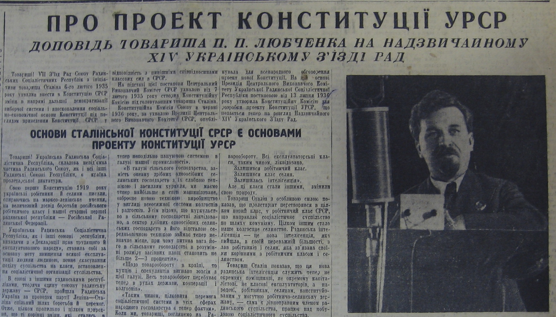 Винесені в заголовок статті слова про незалежність і суверенність радянської України – назва одного з розділів виголошеної 25 січня 1937 р. доповіді очільника уряду, голови Конституційної комісії Панаса Любченка про Конституцію УРСР. Цитата про національну гордість – теж рядок з його виступу.