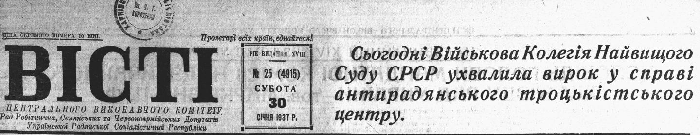 Переможна хода соціалізму начебто підтверджувалася судовим процесом над колишніми опозиціонерами у так званій справі «антирадянського троцькістського центру, який відбувався 23-30 січня у Москві. Суворий вирок було проголошено в один день із затвердженням Конституції УРСР – 30 січня 1937 р.