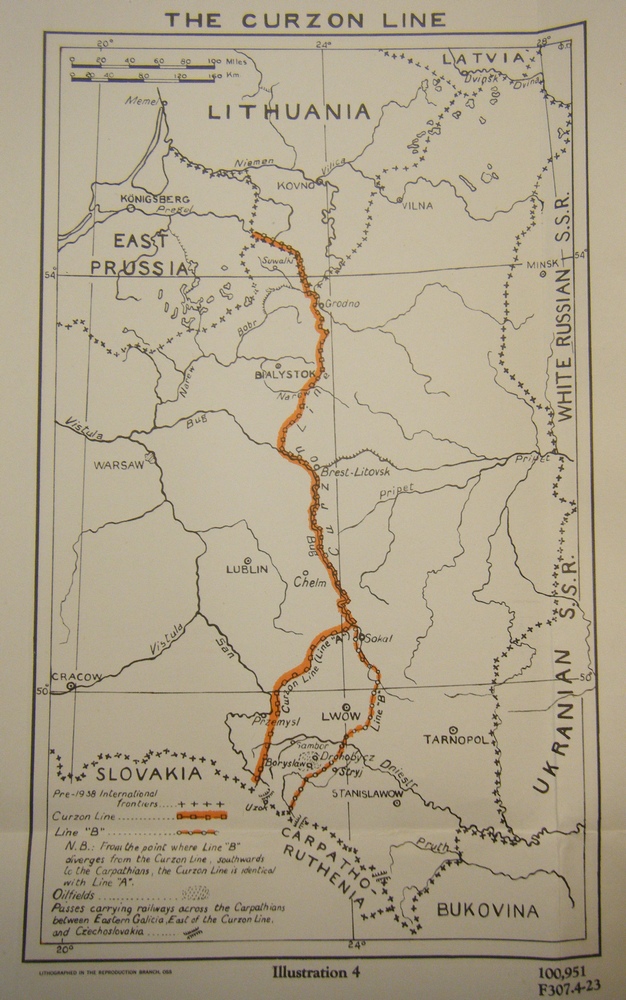 Довідкова карта, уладена американською розвідкою у 1943-му або 1944 р., коли довелося заново з’ясовувати, де проходили всі ті лінії. Лінія 8 грудня 1919 р., як складова пізнішої “Лінії Керзона” починається від стику ліній “А” і “Б” і простягається на північ. Для детального перегляду, тисни на карту