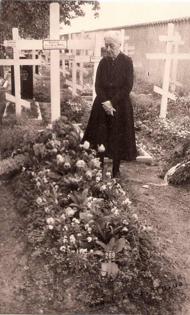 Н.Полонська-Василенко біля могили О.Моргуна. [Після 1962 р.]. Навколо – багато інших поховань, що зараз не існують. Фото з особового фонду Наталії Полонської-Василенко (Архів ім. Дмитра Антоновича Української Вільної Академії Наук у США).