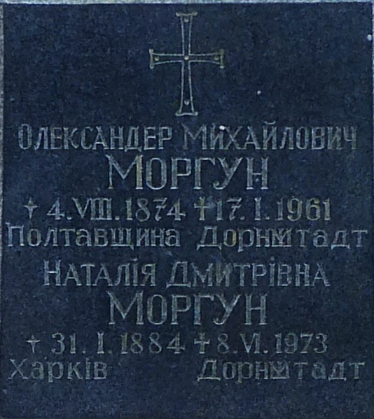 Історія надгробку на могилі подружжя Моргунів заслуговує на окрему розповідь. Він був зведений самою Наталією Дмитрівною після смерті її чоловіка. Олександр Михайлович помер 17 січня 1961 р. Спочатку на його могилі стояв простий дерев’яний хрест із написом “Професор Олександер Михайлович Моргун” та датами його життя.