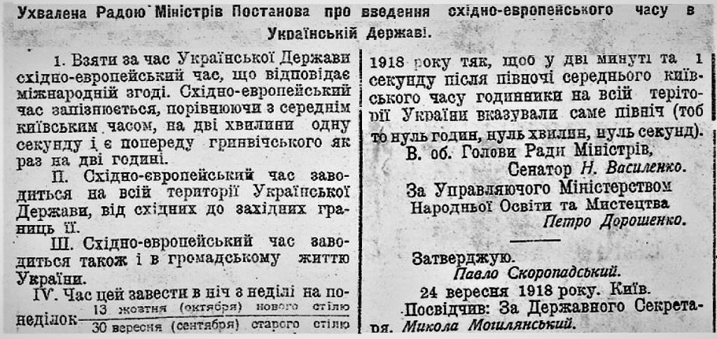 «Час цей завести у ніч з неділі на понеділок 13 жовтня (октября) нового стілю (30 вересня (сентября) старого стілю) 1918 року так, щоб у дві минути та 1 секунду після півночі середнього київського часу годинники на всій території України вказували саме північ (тобто нуль годин, нуль хвилин, нуль секунд)».