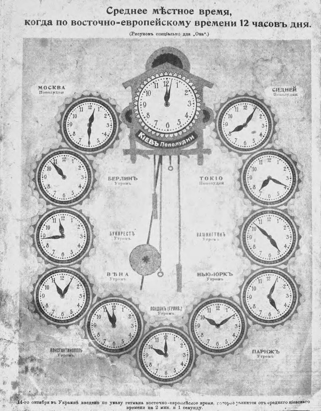 Таким чином, Україна раніше за радянську Росію (денікінці навіть новий календарний стиль не визнавали, тому про хвилинні стрілки годиннника взагалі не йшлося) ввела у себе міжнародний стандартизований час – це коли хвилинна і секундна стрілки показували однакові в міжнародній спільноті значення.