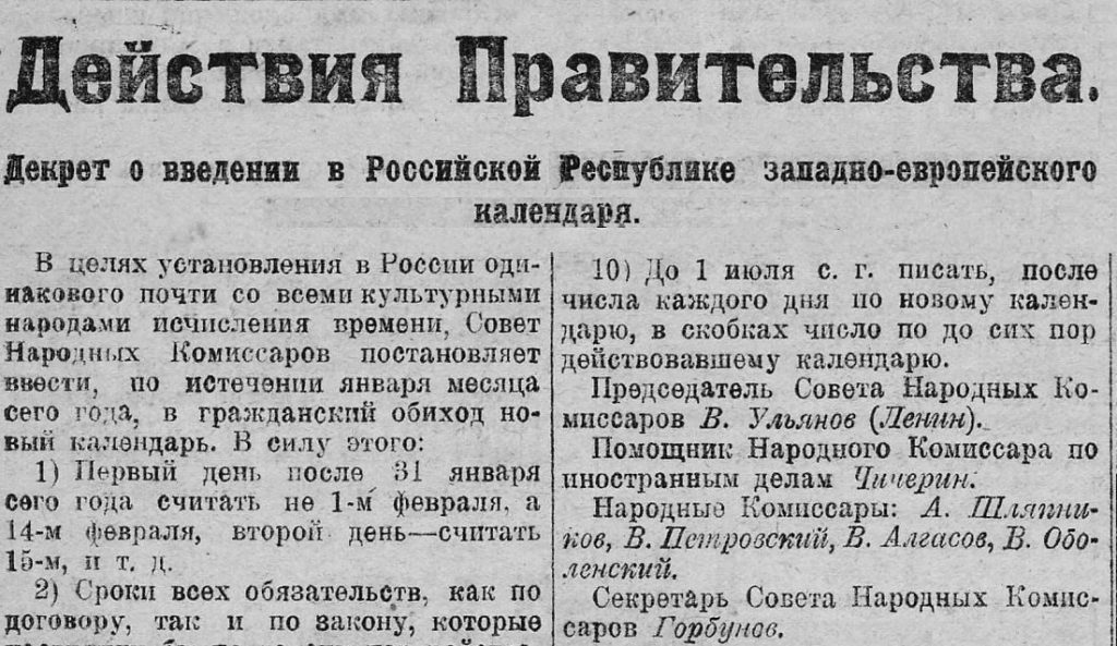 8 лютого (26 січня) 1918 р. РНК РСФРР оприлюднив декрет про переведення на західноєвропейський календар, згідно якого «з метою встановлення в Росії однакового майже з усіма культурними народами обчислення часу» ліквідовувалося відставання від західноєвропейського календаря і після 31 січня за старим стилем наступало 14 лютого – тепер вже за новим. Про зміну часу у цьому рішенні не йшлося, тобто він залишався місцевим і у межах усієї країни не уніфікувався.