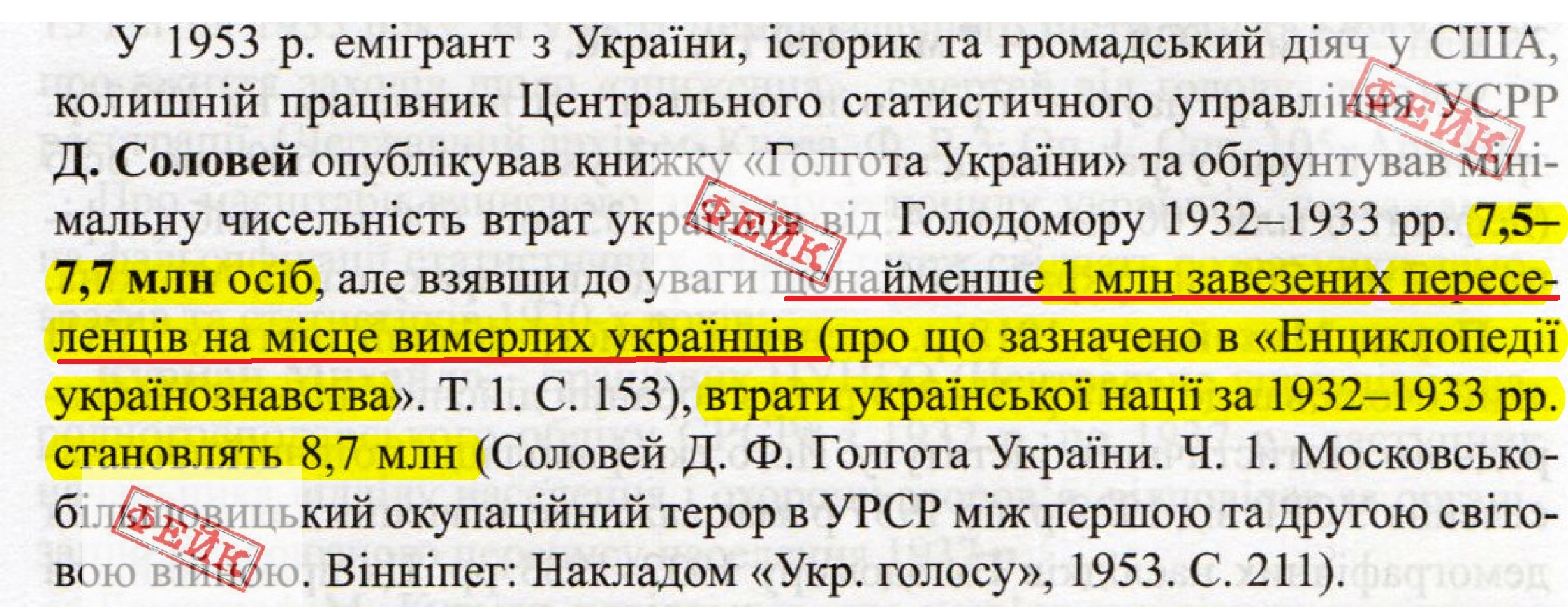 Але просто приписати Соловею те, чого він не казав (а йдеться про «мінімальну чисельність втрат українців від Голодомору 1932–1933 рр.»!) сучасним фальсифікаторам виявилося замало. Вони, як це видно з продемонстрованого вище скану, вирішили перекрутити та сфальсифікувати ще й зміст опублікованого у 1949 українськими науковцями в еміграції першого тому видання, відомого як «Енциклопедія Українознавства. Загальна частина». Сучасні фальсифікатори своїм читачам представили тих, хто писав про смерть від голоду 2–3 млн українців, прихильниками цифри у 8,7 млн втрат! Для цього була проведена груба маніпуляція: згадані в енциклопедії 1 млн можливих (бо цифра під знаком питання) переселенців ДО УСРР в 1930-х роках авторами «експертизи» були вказані, а от 2–3 млн переселенців ЗА межі УСРР – проігноровані. Причому навіть щодо того мільйону «експерти» з псевдонаукового видання умудрилися сказати неправду: мовляв, то були переселенці на «місце вимерлих українців» і про те зазначено в «Енциклопедії українознавства». Надаю читачам скан із вказаної сторінки 153 «Енциклопедії українознавства», щоб вони переконалися, що там зовсім інша картина, ніж намагалися представити автори псевдонаукової «експертизи».